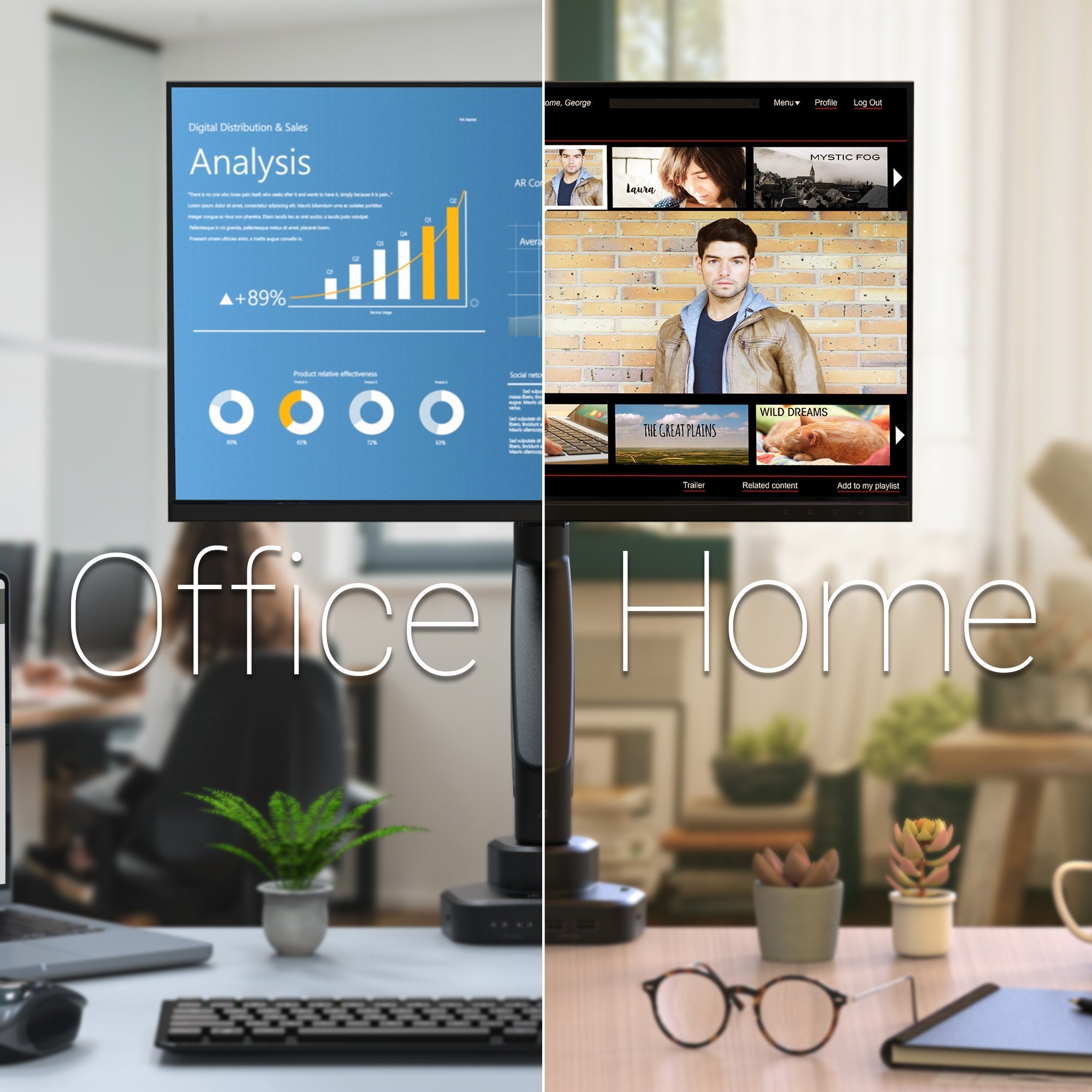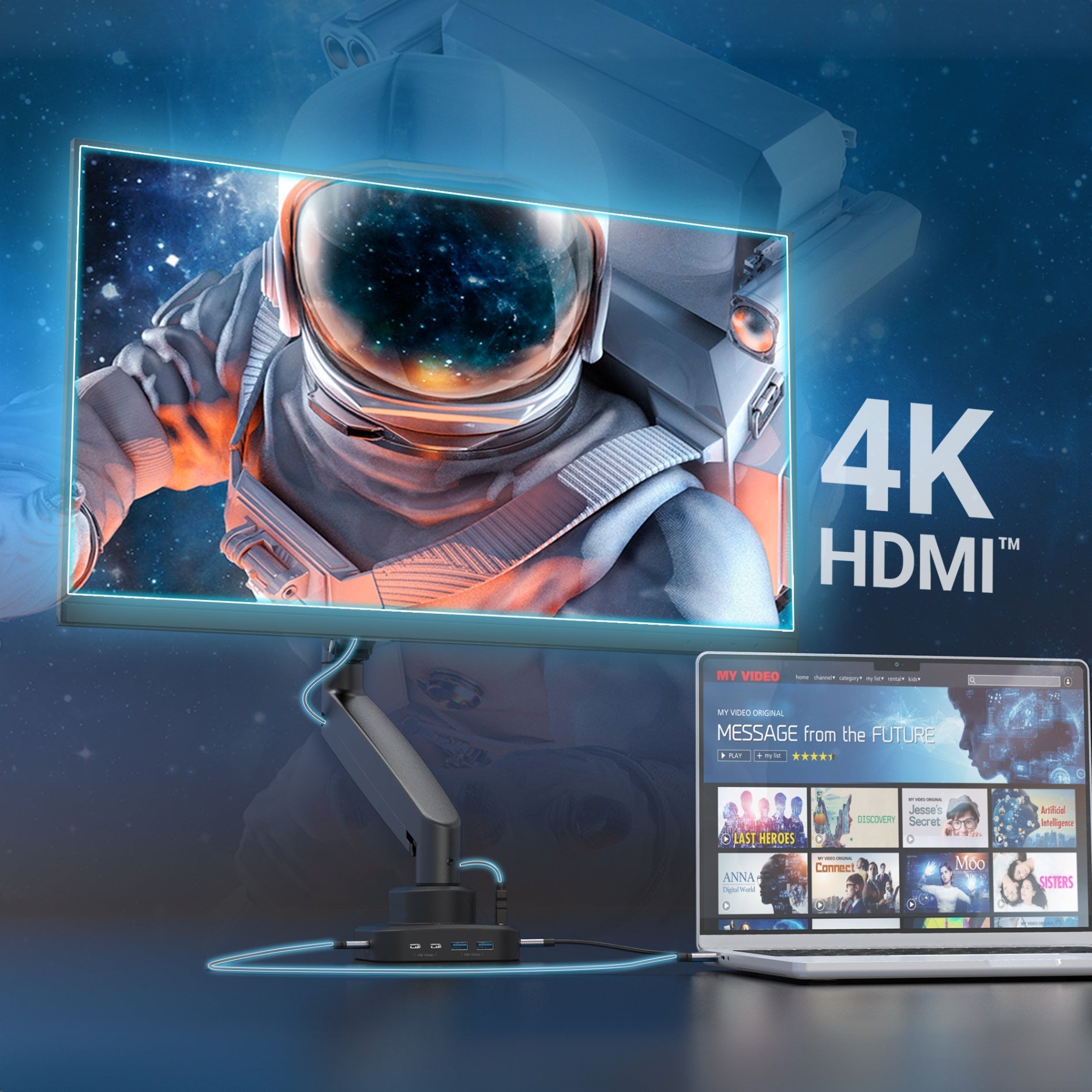 - Fully adjustable gas spring monitor mount with multi-function dock